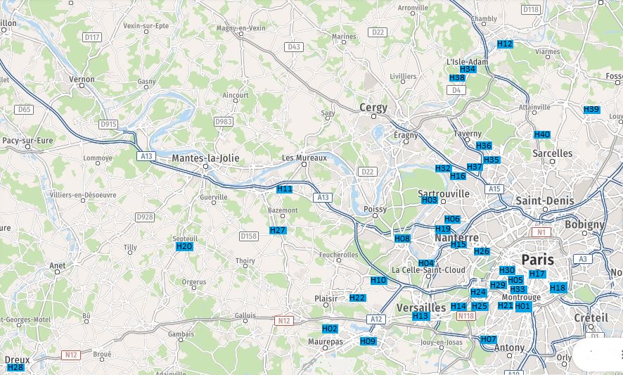 78 Yvelines H04 Bougival H19 Carrières sur Seine H02 Elancourt H11 Flins H06 Houilles Carrières H03 Maisons-Laffitte H27 Maule H09 Montigny le Bretonneux H08 Saint-Germain en Laye H20 Septeuil H13 Versailles H22 Villepreux |