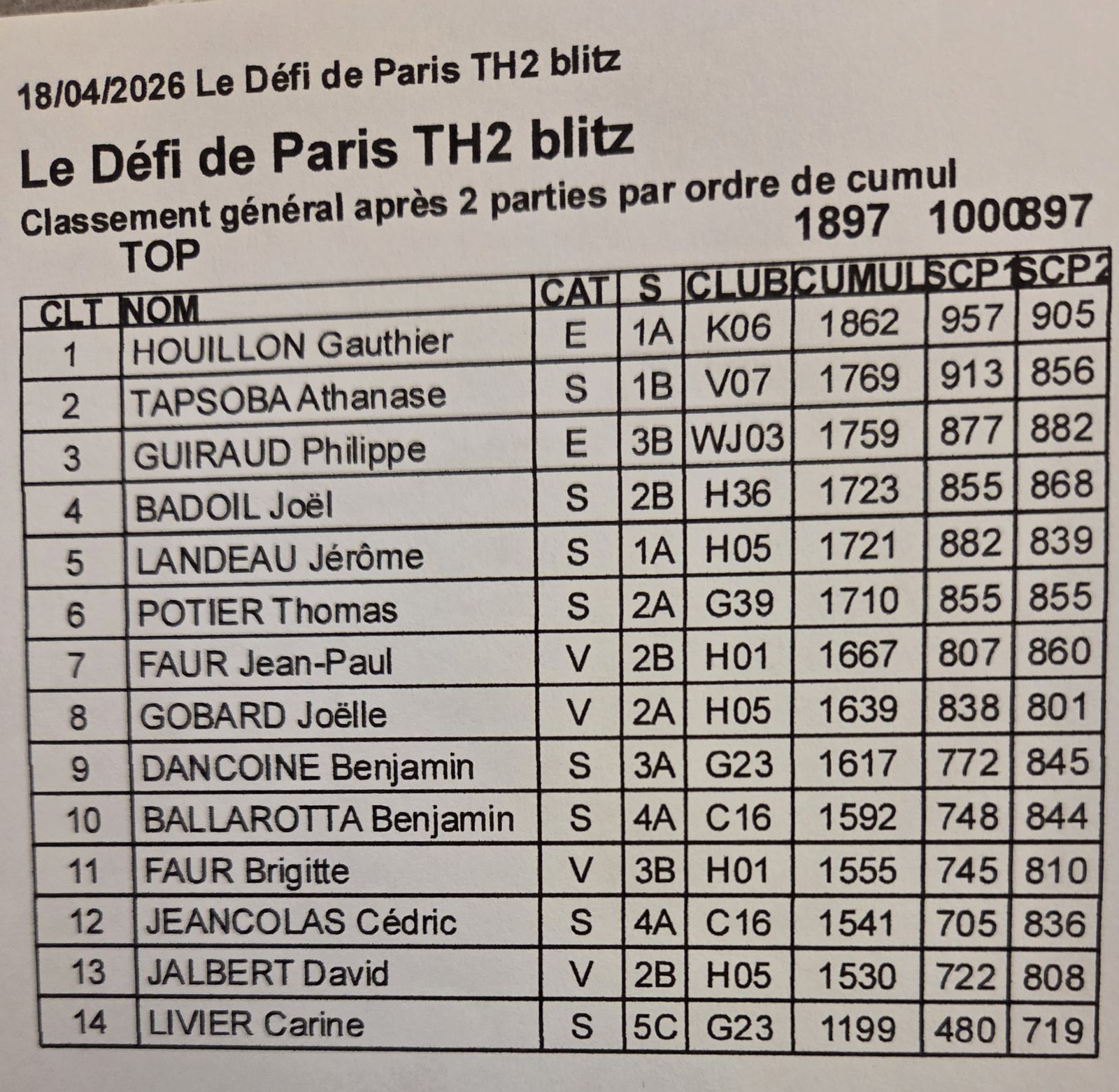 Classement des 2 parties en blitz